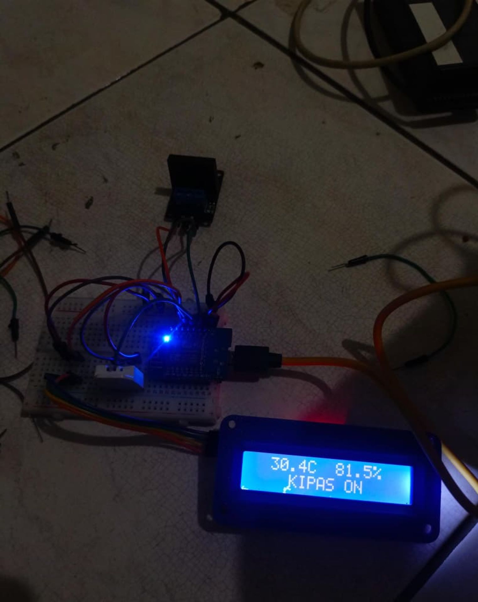 Di LCD, suhu, kelembaban, dan status kipas ditampilkan langsung, jadi kalau web mati pun masih bisa monitoring.